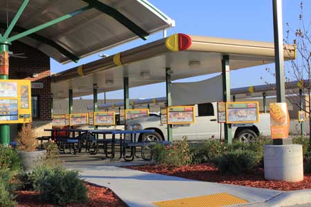 (5) No part of the unit may extend over the public sidewalk or public right-of-way.